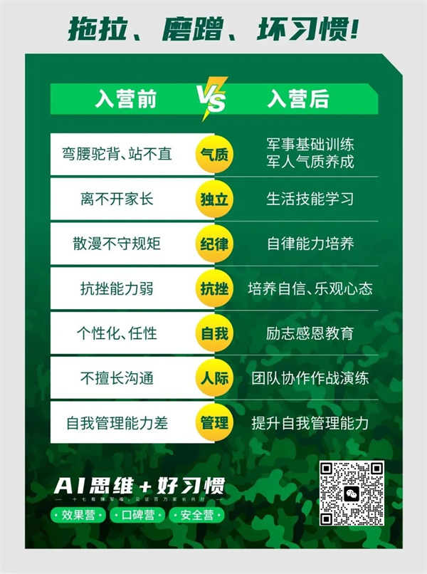 从清晨的起床哨,到夜训、内务PK、战术演练——孩子在全封闭基地管理模式中,学会守时、自律与担当。