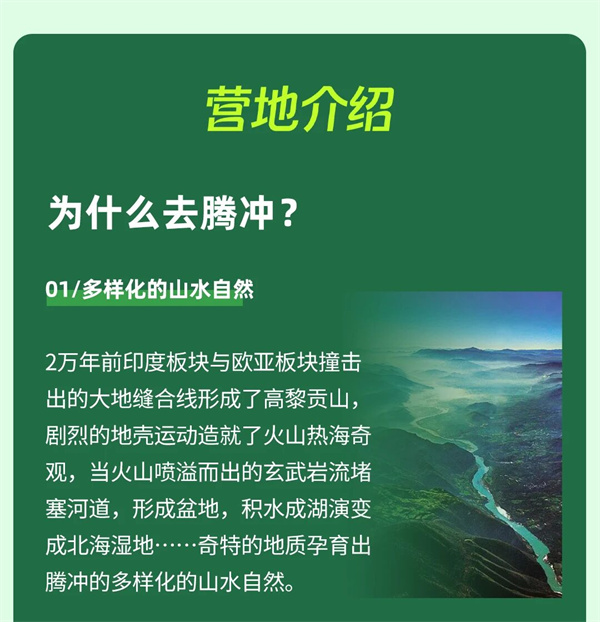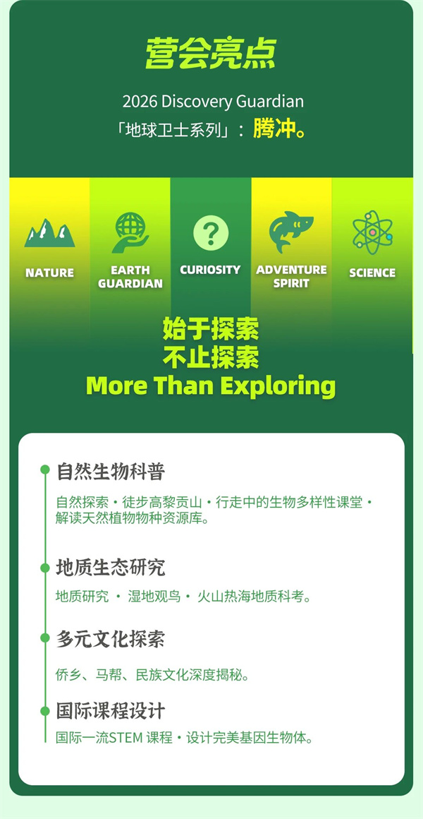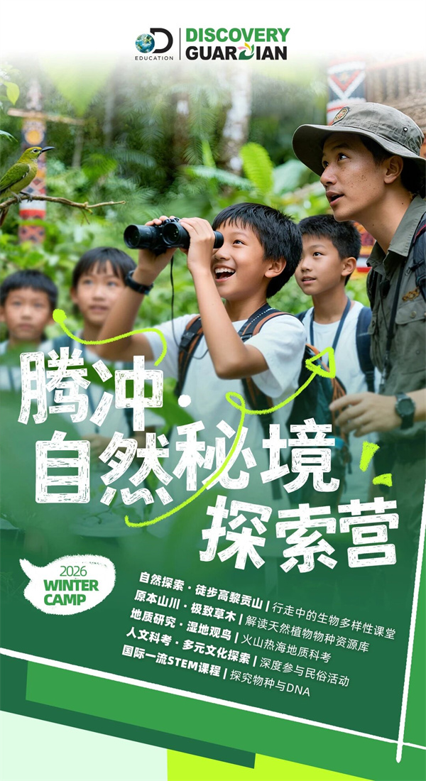 这个假期,我们将带孩子们一起,在Discovery的探索精神引领下,沿着徐霞客的足迹,翻越高黎贡山,走进秘境自然,追寻奇珍异兽的足迹,探索“大地缝合线”中的生物多样性;走进北海湿地观鸟,探秘“水上草原”的飞羽精灵;感受“气冲冲”的热海景观,认识独特的地质奇观;探访边陲六百年小镇的历史风云和人间烟火。