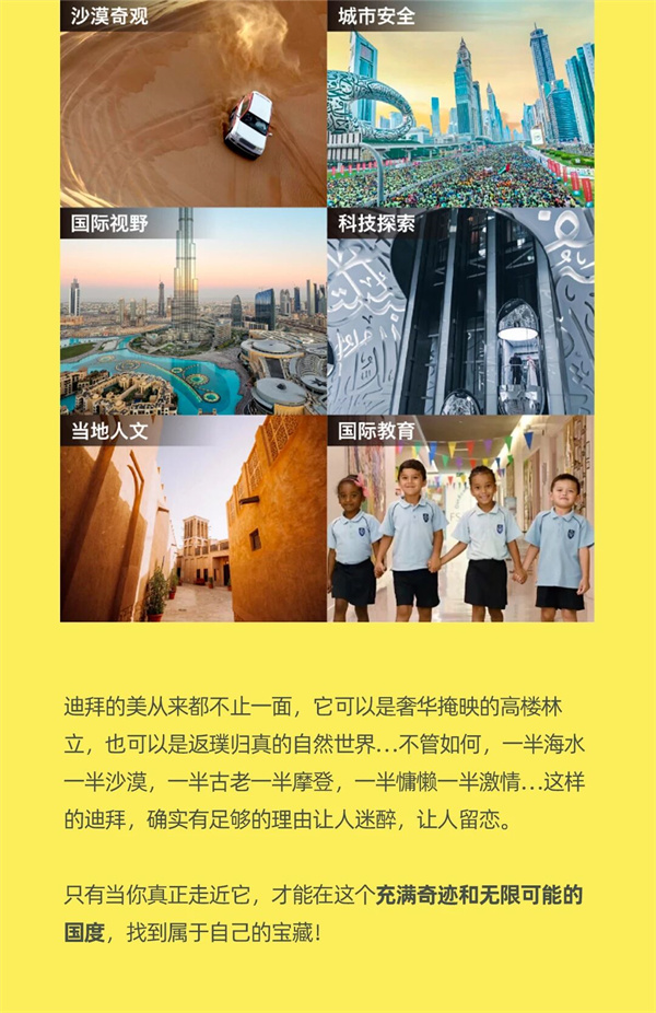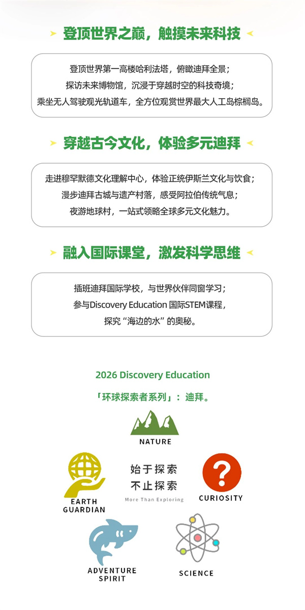 “Discovery Education迪拜超级城市探究营”,自开营至今,已经陪伴逾百组亲子家庭成员玩转迪拜,这个冬天,产品升级,价格新低!让我们再次带孩子们一起,在Discovery的探索精神引领下,共同开启一段充满惊喜的反季迪拜之旅吧!